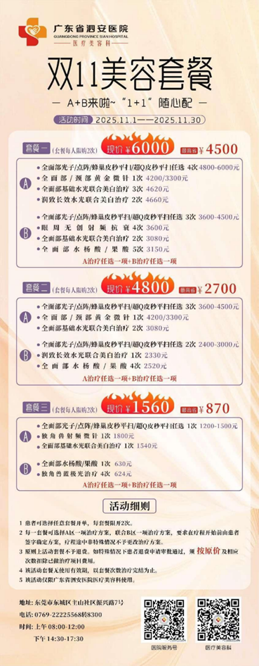 “双十一”购物节即将来临,您是否还在为各种复杂的优惠规则而烦恼?在省公共卫生医学中心(省泗安医院),我们为您准备了简单直接、超值满满的“A+B”美容套餐,让您在变美的路上一路畅行! 精选A区与B区热门美容项目,自由搭配,随心所欲。无论是嫩肤、美白、抗衰还是祛痘,我们都能满足您的个性化美丽需求,助您实现从内到外的全面蜕变!