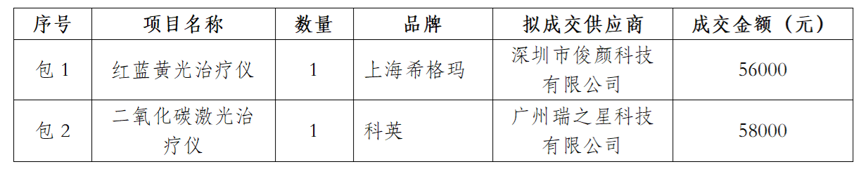医院按照医院采购管理规定对医疗设备红蓝黄光治疗仪和二氧化碳激光治疗仪项目经院内专家评审满足采购需求。现将采购结果公示如下: